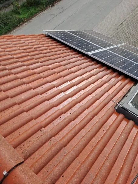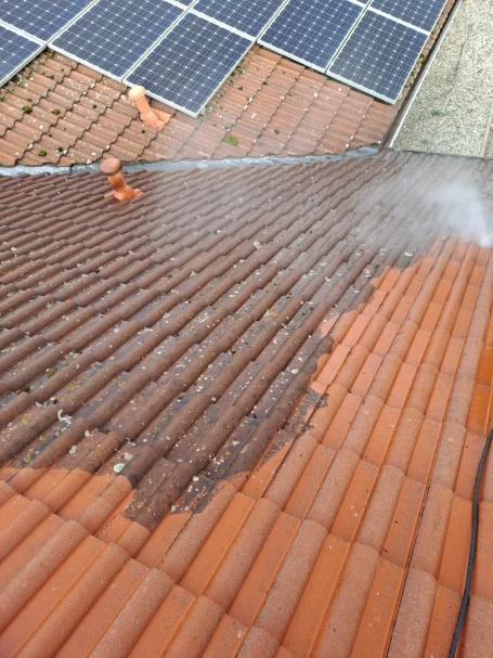 2. Tiefenreinigung: Die gereinigte Fläche wird mit einem speziellen biologisch-abbaubaren Algen- und Flechtenschutz behandelt, um einem erneuten Befall möglichst lange vorzubeugen.